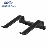 This is a black laptop stand designed to keep your device stable with its non-skid surface. A key feature is the integrated 4-port USB 3.0 hub, allowing you to easily connect multiple peripherals like external drives, mice, and keyboards without needing extra adapters. It helps raise your laptop to a more ergonomic viewing angle while keeping your essential connections organized and within reach.